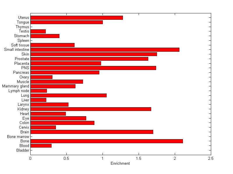 The expression level is normalized with tissue-library size. Each value for a gene in a tissue is a ratio of observed ESTs to the expected one in this tissue. The expected number of ESTs is the product of total ESTs of the gene and the fraction of total ESTs in the tissue among all ESTs in 30 tissues.