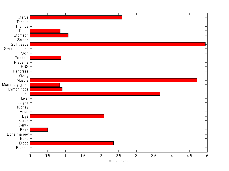 The expression level is normalized with tissue-library size. Each value for a gene in a tissue is a ratio of observed ESTs to the expected one in this tissue. The expected number of ESTs is the product of total ESTs of the gene and the fraction of total ESTs in the tissue among all ESTs in 30 tissues.