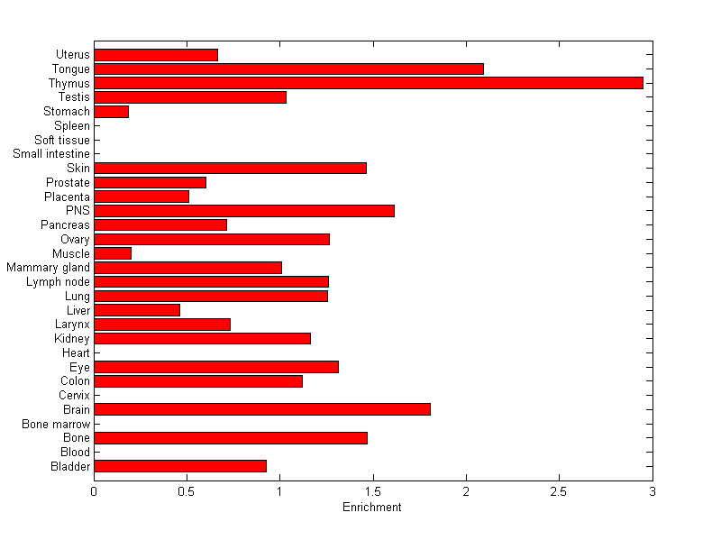 The expression level is normalized with tissue-library size. Each value for a gene in a tissue is a ratio of observed ESTs to the expected one in this tissue. The expected number of ESTs is the product of total ESTs of the gene and the fraction of total ESTs in the tissue among all ESTs in 30 tissues.