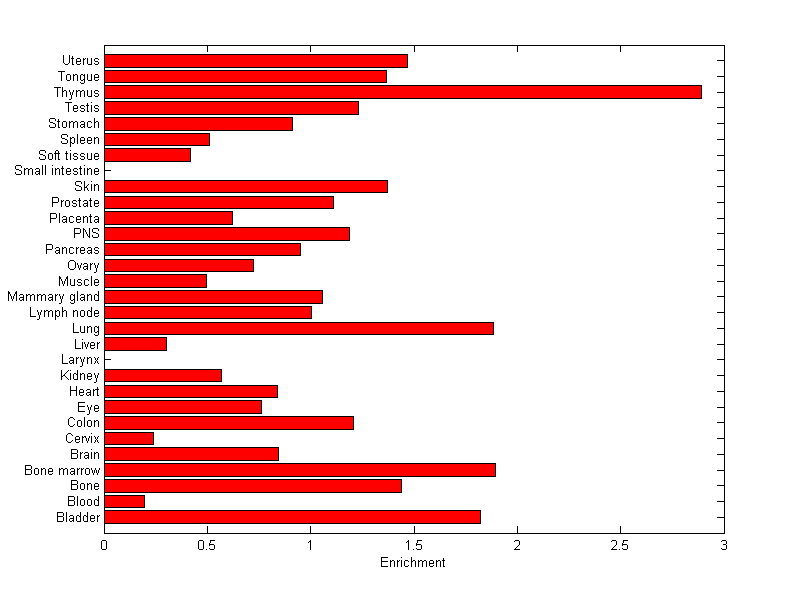 The expression level is normalized with tissue-library size. Each value for a gene in a tissue is a ratio of observed ESTs to the expected one in this tissue. The expected number of ESTs is the product of total ESTs of the gene and the fraction of total ESTs in the tissue among all ESTs in 30 tissues.