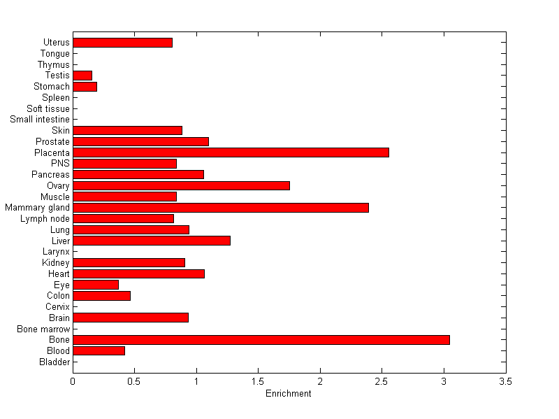 The expression level is normalized with tissue-library size. Each value for a gene in a tissue is a ratio of observed ESTs to the expected one in this tissue. The expected number of ESTs is the product of total ESTs of the gene and the fraction of total ESTs in the tissue among all ESTs in 30 tissues.
