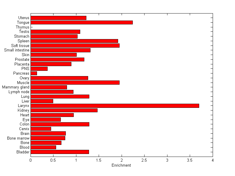 The expression level is normalized with tissue-library size. Each value for a gene in a tissue is a ratio of observed ESTs to the expected one in this tissue. The expected number of ESTs is the product of total ESTs of the gene and the fraction of total ESTs in the tissue among all ESTs in 30 tissues.