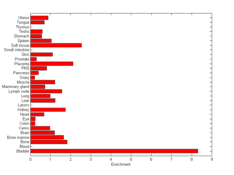 The expression level is normalized with tissue-library size. Each value for a gene in a tissue is a ratio of observed ESTs to the expected one in this tissue. The expected number of ESTs is the product of total ESTs of the gene and the fraction of total ESTs in the tissue among all ESTs in 30 tissues.