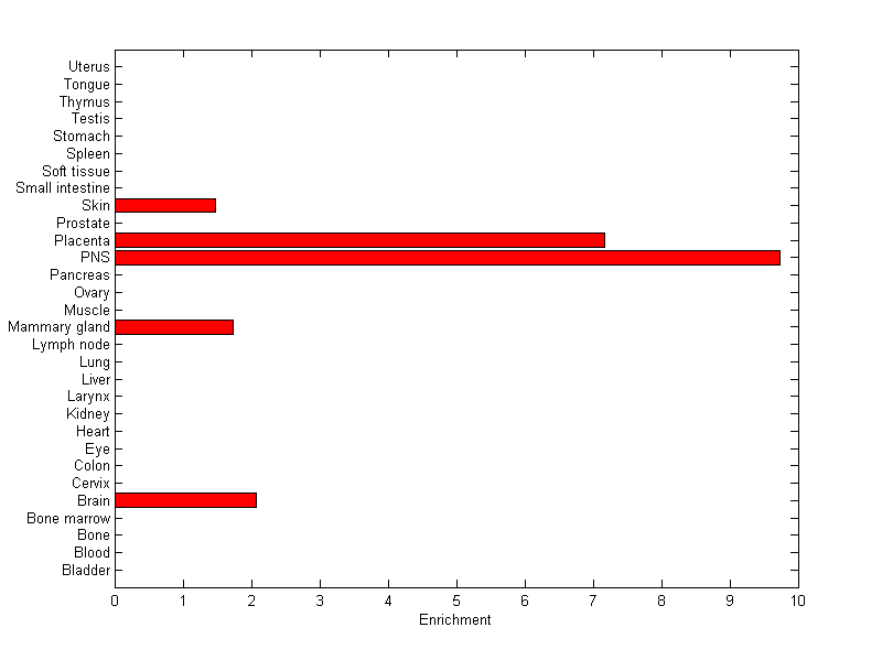 The expression level is normalized with tissue-library size. Each value for a gene in a tissue is a ratio of observed ESTs to the expected one in this tissue. The expected number of ESTs is the product of total ESTs of the gene and the fraction of total ESTs in the tissue among all ESTs in 30 tissues.