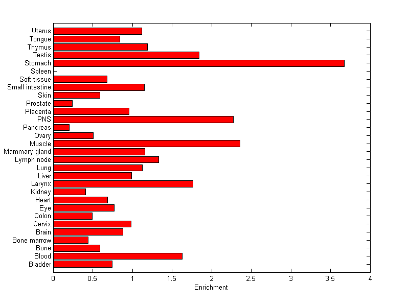 The expression level is normalized with tissue-library size. Each value for a gene in a tissue is a ratio of observed ESTs to the expected one in this tissue. The expected number of ESTs is the product of total ESTs of the gene and the fraction of total ESTs in the tissue among all ESTs in 30 tissues.
