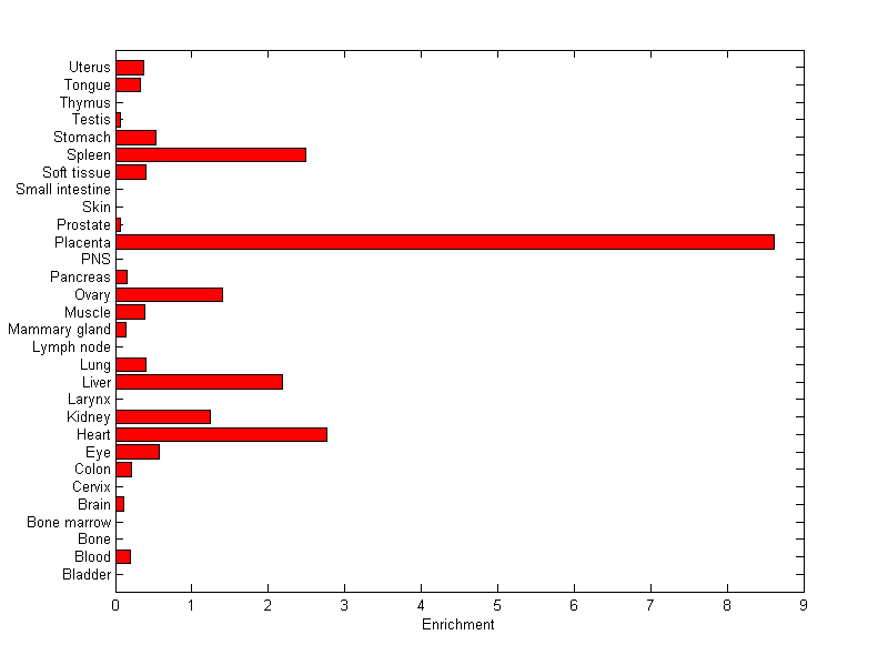 The expression level is normalized with tissue-library size. Each value for a gene in a tissue is a ratio of observed ESTs to the expected one in this tissue. The expected number of ESTs is the product of total ESTs of the gene and the fraction of total ESTs in the tissue among all ESTs in 30 tissues.