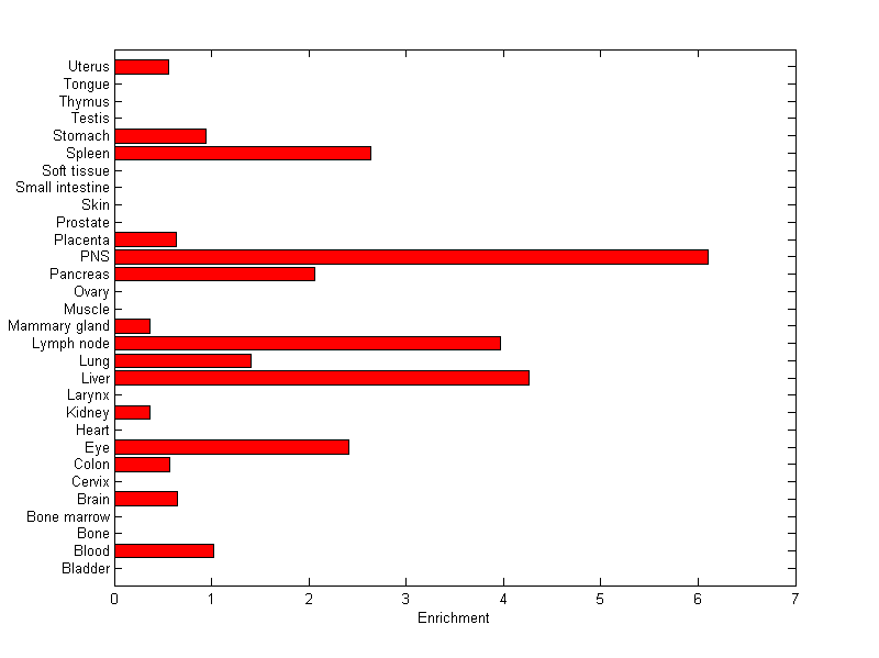 The expression level is normalized with tissue-library size. Each value for a gene in a tissue is a ratio of observed ESTs to the expected one in this tissue. The expected number of ESTs is the product of total ESTs of the gene and the fraction of total ESTs in the tissue among all ESTs in 30 tissues.