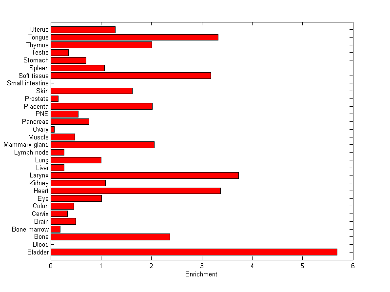 The expression level is normalized with tissue-library size. Each value for a gene in a tissue is a ratio of observed ESTs to the expected one in this tissue. The expected number of ESTs is the product of total ESTs of the gene and the fraction of total ESTs in the tissue among all ESTs in 30 tissues.