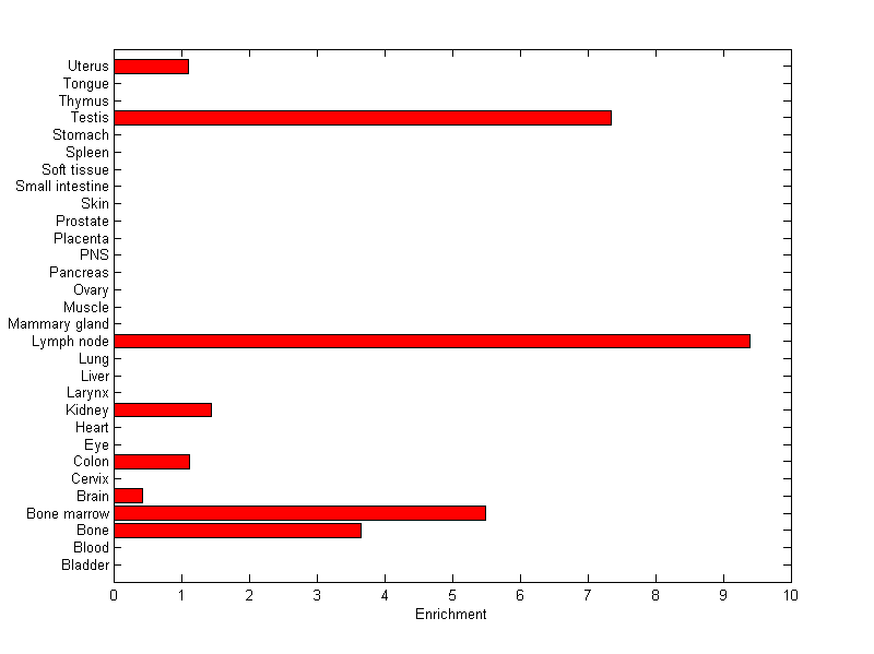 The expression level is normalized with tissue-library size. Each value for a gene in a tissue is a ratio of observed ESTs to the expected one in this tissue. The expected number of ESTs is the product of total ESTs of the gene and the fraction of total ESTs in the tissue among all ESTs in 30 tissues.