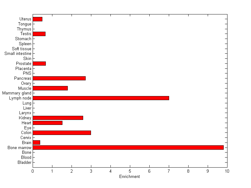 About the profile: The expression level is normalized with tissue-library size. Each value for a gene in a tissue is a ratio of observed ESTs to the expected one in this tissue. The expected number of ESTs is the product of total ESTs of the gene and the fraction of total ESTs in the tissue among all ESTs in 30 tissues. Summary: This gene is preferentially expressed in [lymph_node] Download: |
