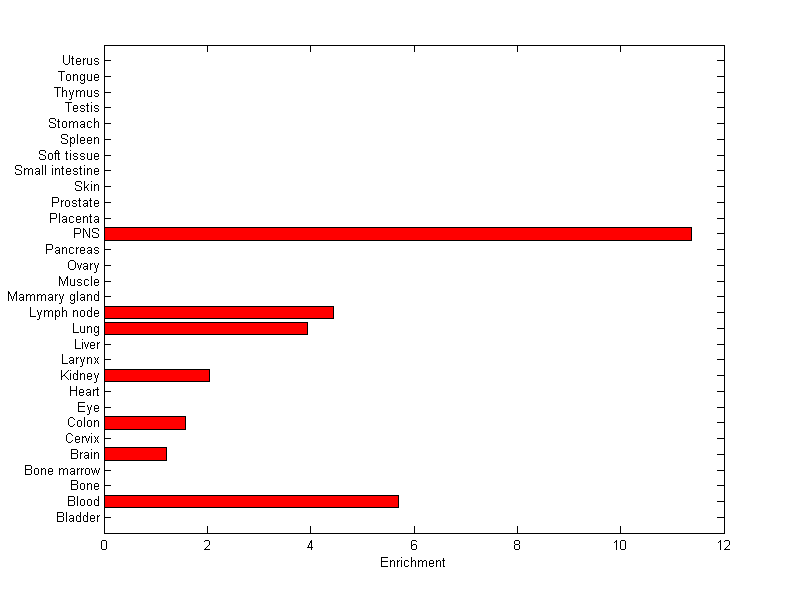 The expression level is normalized with tissue-library size. Each value for a gene in a tissue is a ratio of observed ESTs to the expected one in this tissue. The expected number of ESTs is the product of total ESTs of the gene and the fraction of total ESTs in the tissue among all ESTs in 30 tissues.