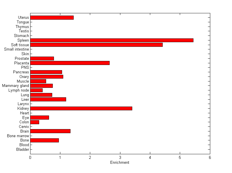 The expression level is normalized with tissue-library size. Each value for a gene in a tissue is a ratio of observed ESTs to the expected one in this tissue. The expected number of ESTs is the product of total ESTs of the gene and the fraction of total ESTs in the tissue among all ESTs in 30 tissues.
