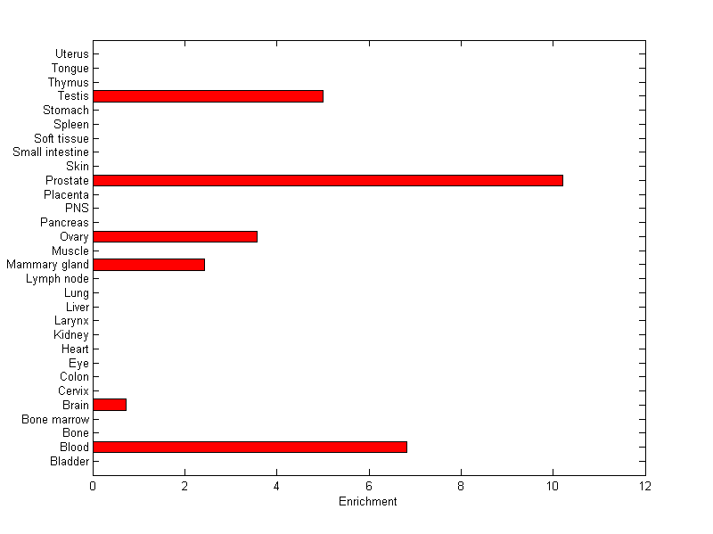The expression level is normalized with tissue-library size. Each value for a gene in a tissue is a ratio of observed ESTs to the expected one in this tissue. The expected number of ESTs is the product of total ESTs of the gene and the fraction of total ESTs in the tissue among all ESTs in 30 tissues.