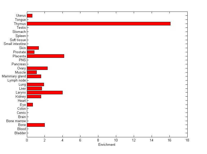 The expression level is normalized with tissue-library size. Each value for a gene in a tissue is a ratio of observed ESTs to the expected one in this tissue. The expected number of ESTs is the product of total ESTs of the gene and the fraction of total ESTs in the tissue among all ESTs in 30 tissues.