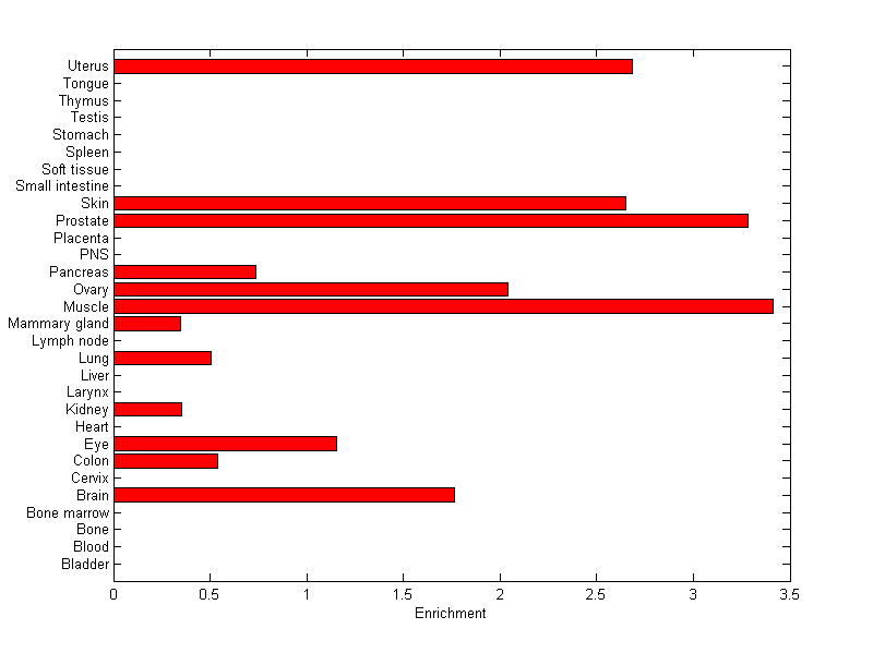 The expression level is normalized with tissue-library size. Each value for a gene in a tissue is a ratio of observed ESTs to the expected one in this tissue. The expected number of ESTs is the product of total ESTs of the gene and the fraction of total ESTs in the tissue among all ESTs in 30 tissues.