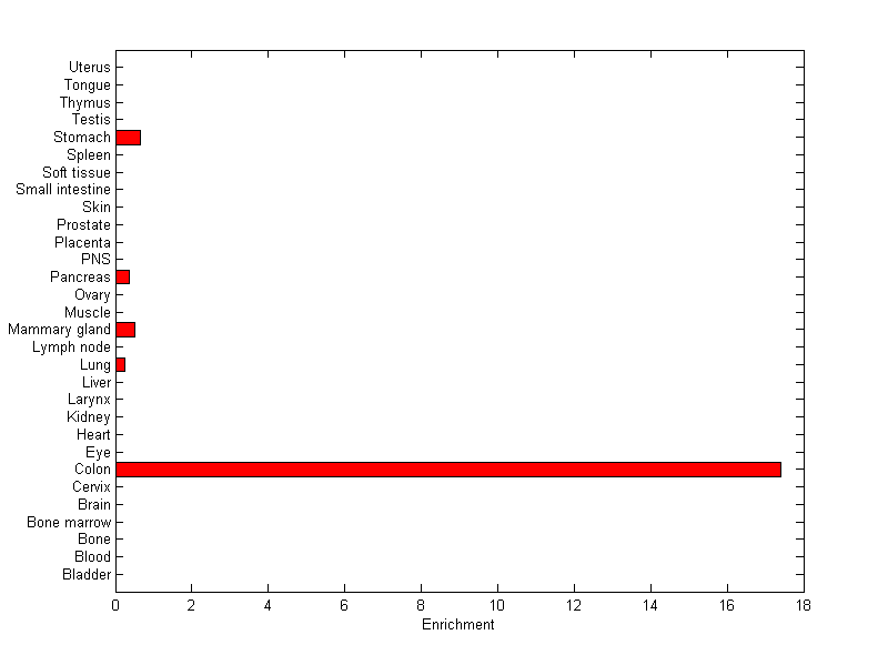The expression level is normalized with tissue-library size. Each value for a gene in a tissue is a ratio of observed ESTs to the expected one in this tissue. The expected number of ESTs is the product of total ESTs of the gene and the fraction of total ESTs in the tissue among all ESTs in 30 tissues.