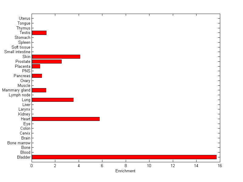 The expression level is normalized with tissue-library size. Each value for a gene in a tissue is a ratio of observed ESTs to the expected one in this tissue. The expected number of ESTs is the product of total ESTs of the gene and the fraction of total ESTs in the tissue among all ESTs in 30 tissues.