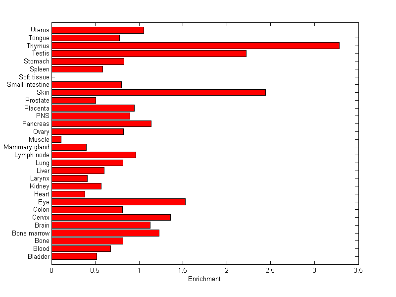 The expression level is normalized with tissue-library size. Each value for a gene in a tissue is a ratio of observed ESTs to the expected one in this tissue. The expected number of ESTs is the product of total ESTs of the gene and the fraction of total ESTs in the tissue among all ESTs in 30 tissues.