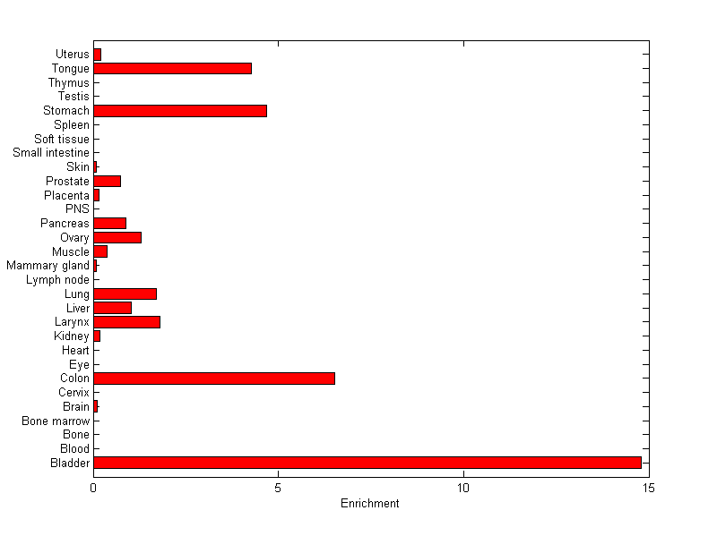 About the profile: The expression level is normalized with tissue-library size. Each value for a gene in a tissue is a ratio of observed ESTs to the expected one in this tissue. The expected number of ESTs is the product of total ESTs of the gene and the fraction of total ESTs in the tissue among all ESTs in 30 tissues. Summary: This gene is preferentially expressed in [bladder, colon] Download: |