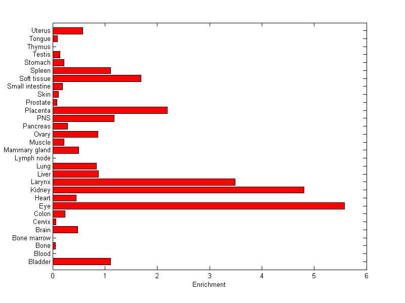 The expression level is normalized with tissue-library size. Each value for a gene in a tissue is a ratio of observed ESTs to the expected one in this tissue. The expected number of ESTs is the product of total ESTs of the gene and the fraction of total ESTs in the tissue among all ESTs in 30 tissues.