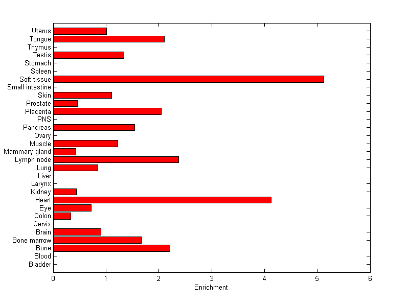 The expression level is normalized with tissue-library size. Each value for a gene in a tissue is a ratio of observed ESTs to the expected one in this tissue. The expected number of ESTs is the product of total ESTs of the gene and the fraction of total ESTs in the tissue among all ESTs in 30 tissues.