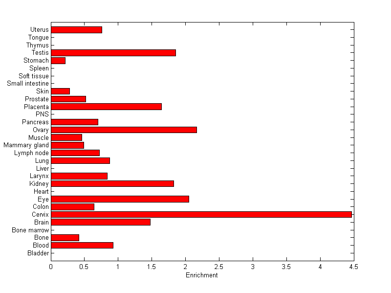 The expression level is normalized with tissue-library size. Each value for a gene in a tissue is a ratio of observed ESTs to the expected one in this tissue. The expected number of ESTs is the product of total ESTs of the gene and the fraction of total ESTs in the tissue among all ESTs in 30 tissues.
