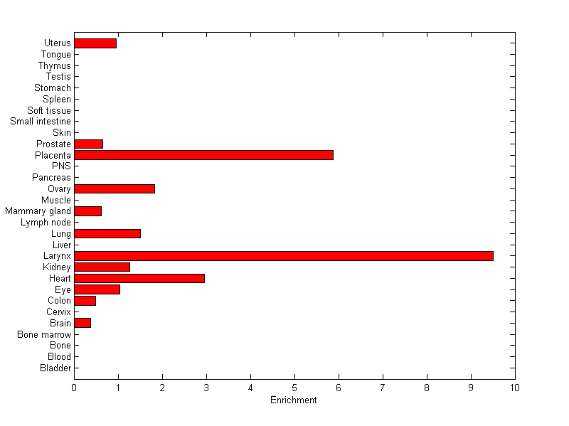 The expression level is normalized with tissue-library size. Each value for a gene in a tissue is a ratio of observed ESTs to the expected one in this tissue. The expected number of ESTs is the product of total ESTs of the gene and the fraction of total ESTs in the tissue among all ESTs in 30 tissues.