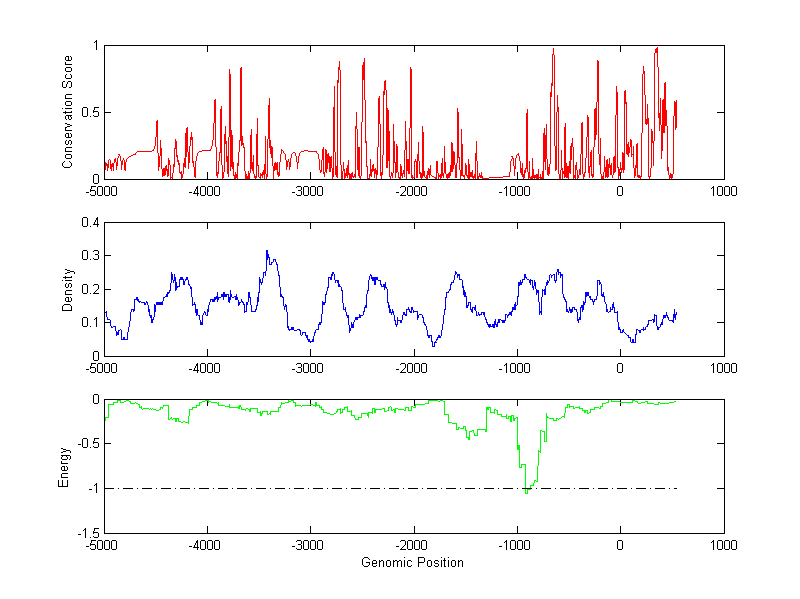 The energy profile (green curve) is about energy for module detection based on TF interaction. The positions with energy less than -1 indicate the existence of CRMs.