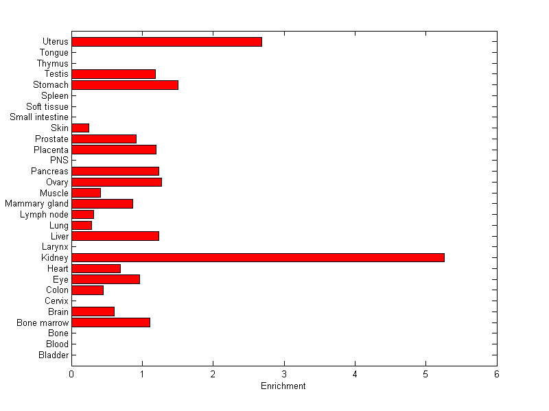 The expression level is normalized with tissue-library size. Each value for a gene in a tissue is a ratio of observed ESTs to the expected one in this tissue. The expected number of ESTs is the product of total ESTs of the gene and the fraction of total ESTs in the tissue among all ESTs in 30 tissues.