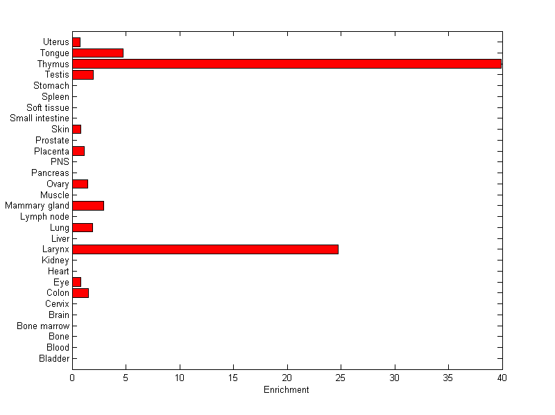 The expression level is normalized with tissue-library size. Each value for a gene in a tissue is a ratio of observed ESTs to the expected one in this tissue. The expected number of ESTs is the product of total ESTs of the gene and the fraction of total ESTs in the tissue among all ESTs in 30 tissues.