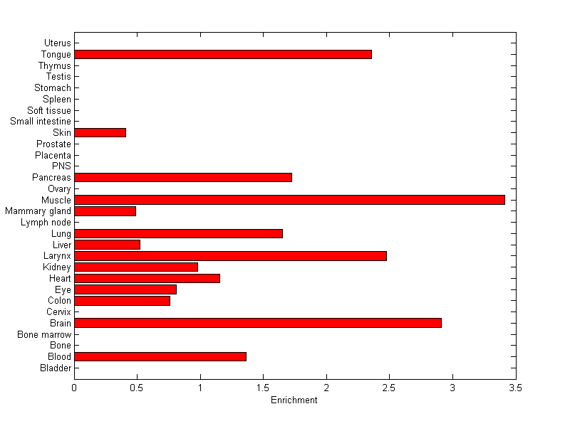 The expression level is normalized with tissue-library size. Each value for a gene in a tissue is a ratio of observed ESTs to the expected one in this tissue. The expected number of ESTs is the product of total ESTs of the gene and the fraction of total ESTs in the tissue among all ESTs in 30 tissues.