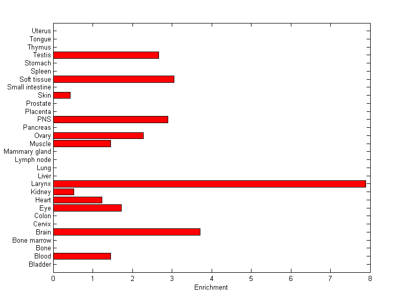 The expression level is normalized with tissue-library size. Each value for a gene in a tissue is a ratio of observed ESTs to the expected one in this tissue. The expected number of ESTs is the product of total ESTs of the gene and the fraction of total ESTs in the tissue among all ESTs in 30 tissues.