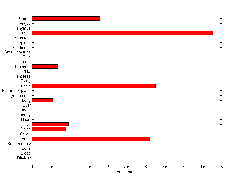 The expression level is normalized with tissue-library size. Each value for a gene in a tissue is a ratio of observed ESTs to the expected one in this tissue. The expected number of ESTs is the product of total ESTs of the gene and the fraction of total ESTs in the tissue among all ESTs in 30 tissues.