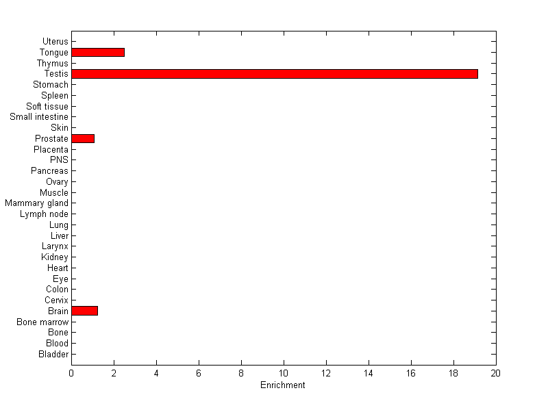 The expression level is normalized with tissue-library size. Each value for a gene in a tissue is a ratio of observed ESTs to the expected one in this tissue. The expected number of ESTs is the product of total ESTs of the gene and the fraction of total ESTs in the tissue among all ESTs in 30 tissues.
