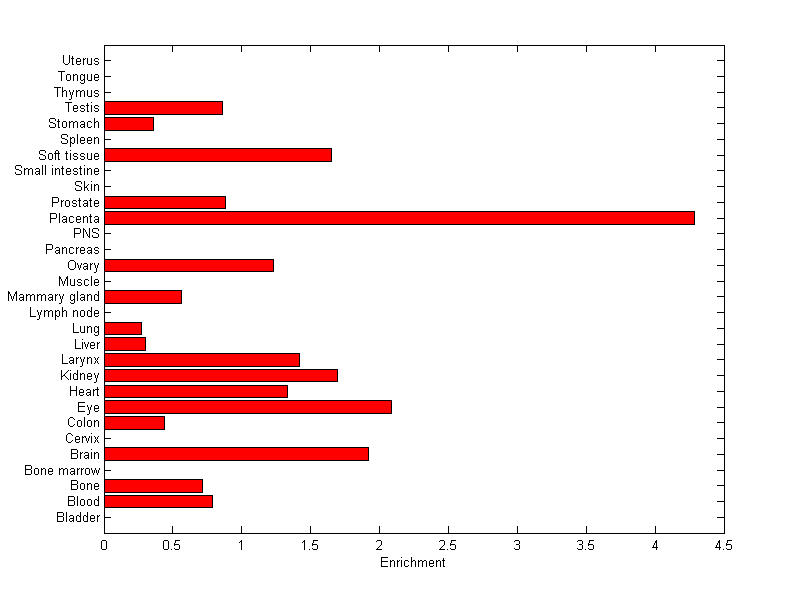 The expression level is normalized with tissue-library size. Each value for a gene in a tissue is a ratio of observed ESTs to the expected one in this tissue. The expected number of ESTs is the product of total ESTs of the gene and the fraction of total ESTs in the tissue among all ESTs in 30 tissues.
