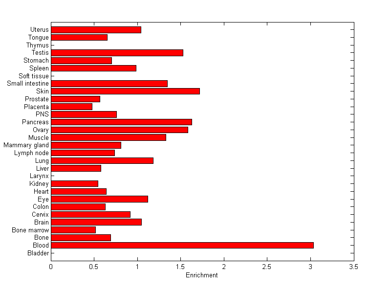 The expression level is normalized with tissue-library size. Each value for a gene in a tissue is a ratio of observed ESTs to the expected one in this tissue. The expected number of ESTs is the product of total ESTs of the gene and the fraction of total ESTs in the tissue among all ESTs in 30 tissues.