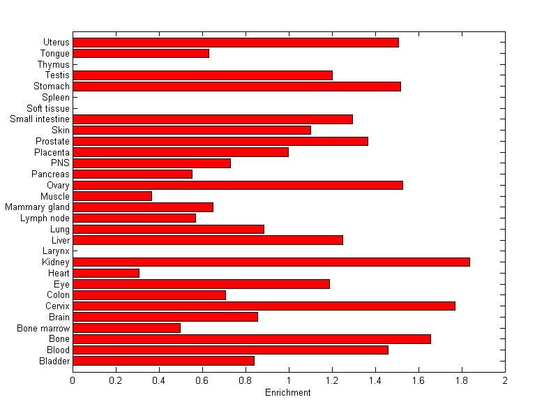 The expression level is normalized with tissue-library size. Each value for a gene in a tissue is a ratio of observed ESTs to the expected one in this tissue. The expected number of ESTs is the product of total ESTs of the gene and the fraction of total ESTs in the tissue among all ESTs in 30 tissues.