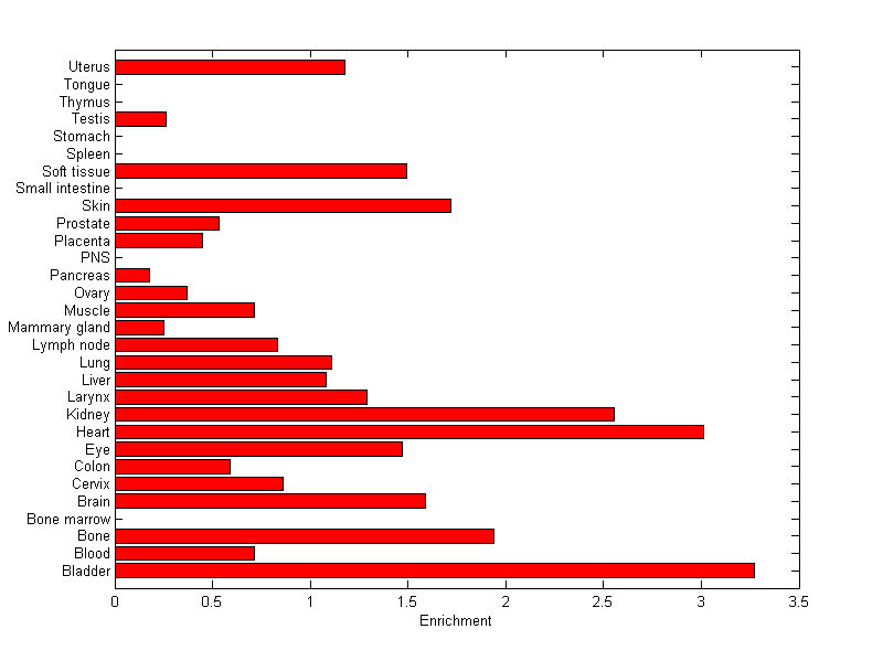 The expression level is normalized with tissue-library size. Each value for a gene in a tissue is a ratio of observed ESTs to the expected one in this tissue. The expected number of ESTs is the product of total ESTs of the gene and the fraction of total ESTs in the tissue among all ESTs in 30 tissues.