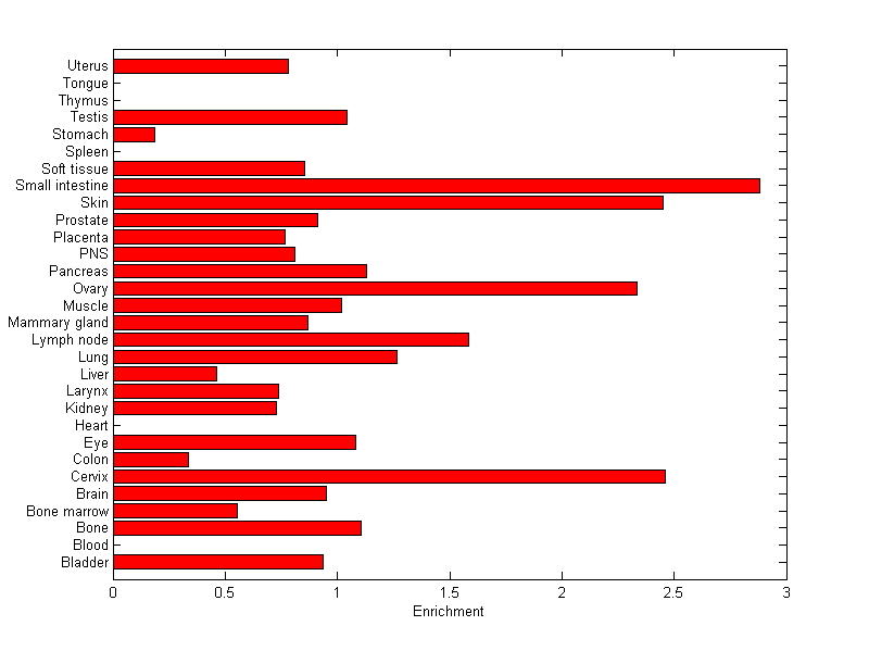The expression level is normalized with tissue-library size. Each value for a gene in a tissue is a ratio of observed ESTs to the expected one in this tissue. The expected number of ESTs is the product of total ESTs of the gene and the fraction of total ESTs in the tissue among all ESTs in 30 tissues.