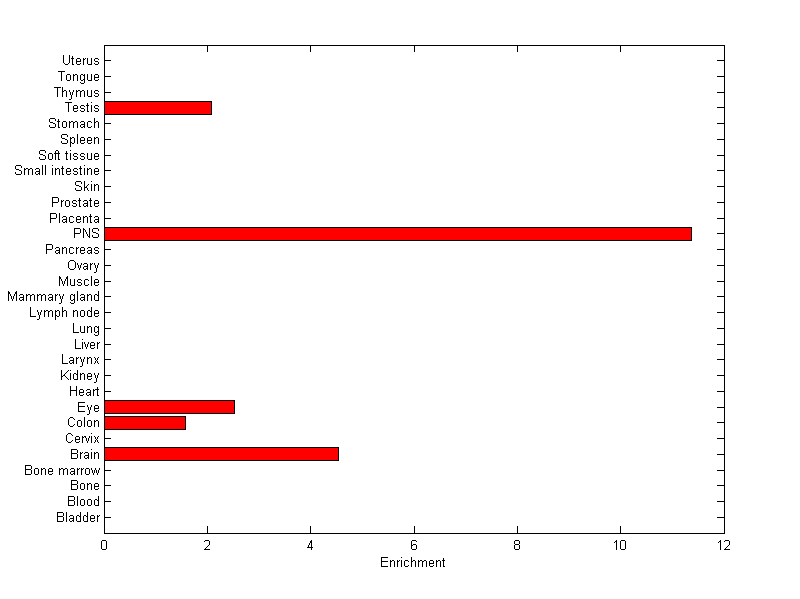 About the profile: The expression level is normalized with tissue-library size. Each value for a gene in a tissue is a ratio of observed ESTs to the expected one in this tissue. The expected number of ESTs is the product of total ESTs of the gene and the fraction of total ESTs in the tissue among all ESTs in 30 tissues. Download: |