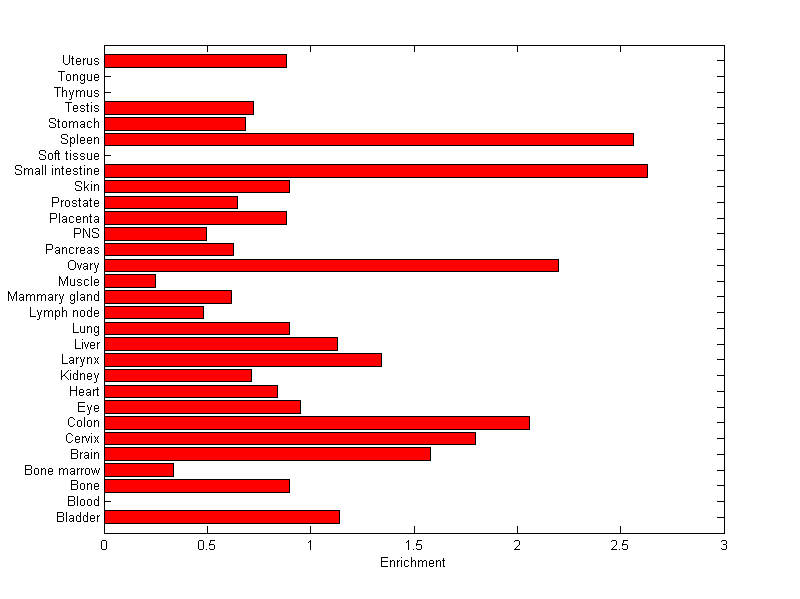 The expression level is normalized with tissue-library size. Each value for a gene in a tissue is a ratio of observed ESTs to the expected one in this tissue. The expected number of ESTs is the product of total ESTs of the gene and the fraction of total ESTs in the tissue among all ESTs in 30 tissues.