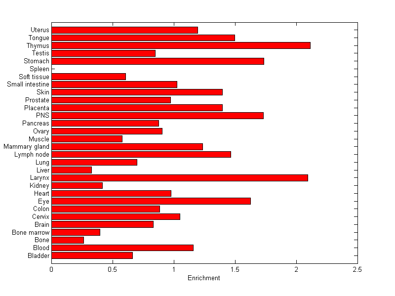The expression level is normalized with tissue-library size. Each value for a gene in a tissue is a ratio of observed ESTs to the expected one in this tissue. The expected number of ESTs is the product of total ESTs of the gene and the fraction of total ESTs in the tissue among all ESTs in 30 tissues.
