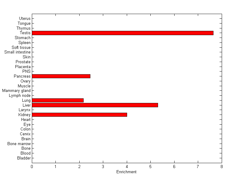 About the profile: The expression level is normalized with tissue-library size. Each value for a gene in a tissue is a ratio of observed ESTs to the expected one in this tissue. The expected number of ESTs is the product of total ESTs of the gene and the fraction of total ESTs in the tissue among all ESTs in 30 tissues. Summary: This gene is preferentially expressed in [liver, testis] Download: |