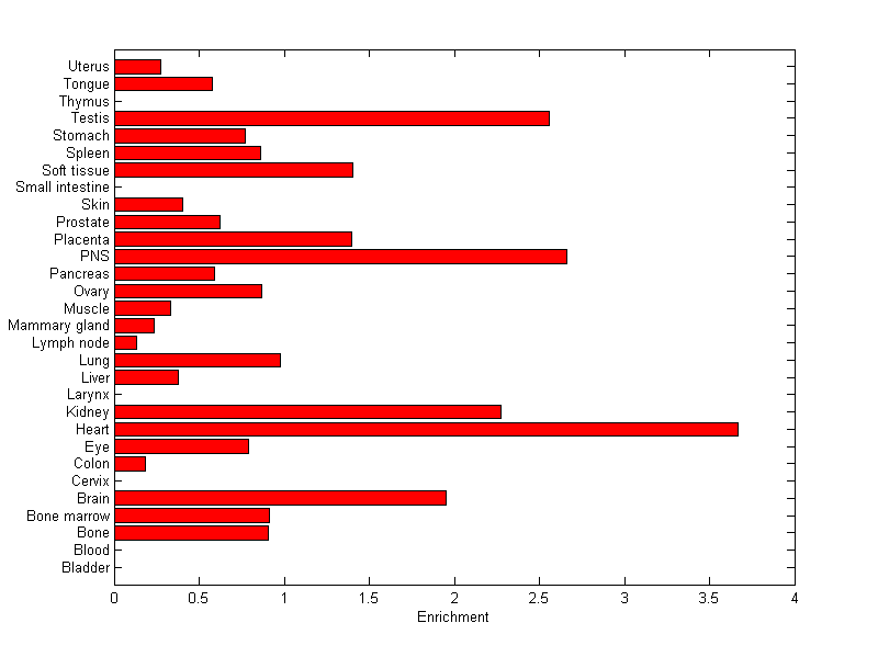 The expression level is normalized with tissue-library size. Each value for a gene in a tissue is a ratio of observed ESTs to the expected one in this tissue. The expected number of ESTs is the product of total ESTs of the gene and the fraction of total ESTs in the tissue among all ESTs in 30 tissues.