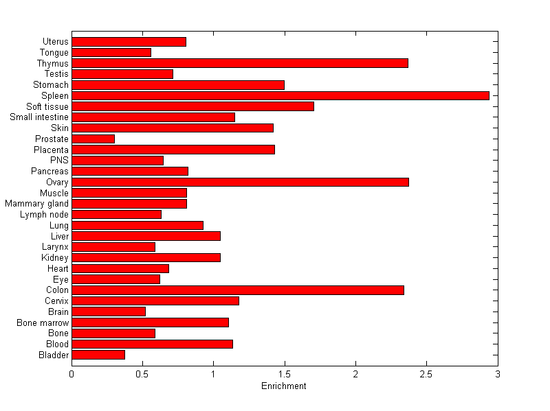 The expression level is normalized with tissue-library size. Each value for a gene in a tissue is a ratio of observed ESTs to the expected one in this tissue. The expected number of ESTs is the product of total ESTs of the gene and the fraction of total ESTs in the tissue among all ESTs in 30 tissues.