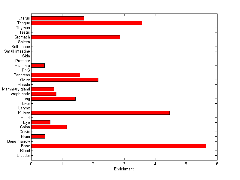 The expression level is normalized with tissue-library size. Each value for a gene in a tissue is a ratio of observed ESTs to the expected one in this tissue. The expected number of ESTs is the product of total ESTs of the gene and the fraction of total ESTs in the tissue among all ESTs in 30 tissues.