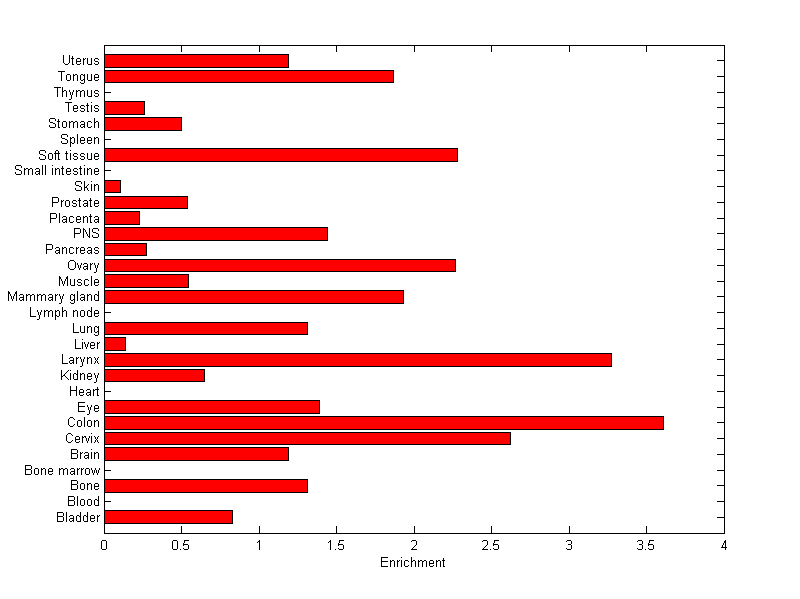 The expression level is normalized with tissue-library size. Each value for a gene in a tissue is a ratio of observed ESTs to the expected one in this tissue. The expected number of ESTs is the product of total ESTs of the gene and the fraction of total ESTs in the tissue among all ESTs in 30 tissues.