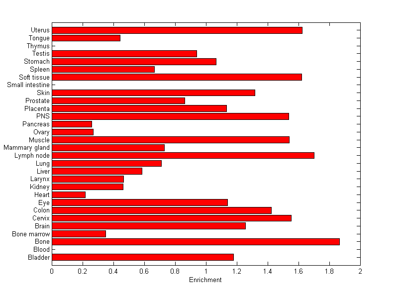The expression level is normalized with tissue-library size. Each value for a gene in a tissue is a ratio of observed ESTs to the expected one in this tissue. The expected number of ESTs is the product of total ESTs of the gene and the fraction of total ESTs in the tissue among all ESTs in 30 tissues.