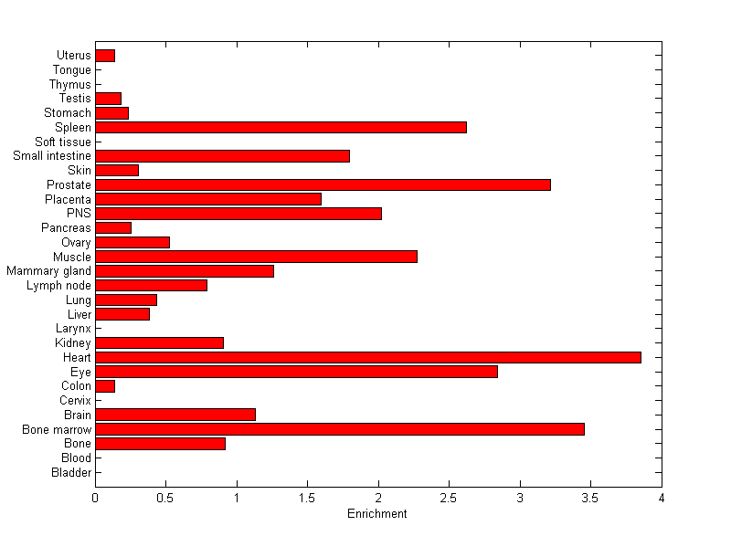 The expression level is normalized with tissue-library size. Each value for a gene in a tissue is a ratio of observed ESTs to the expected one in this tissue. The expected number of ESTs is the product of total ESTs of the gene and the fraction of total ESTs in the tissue among all ESTs in 30 tissues.