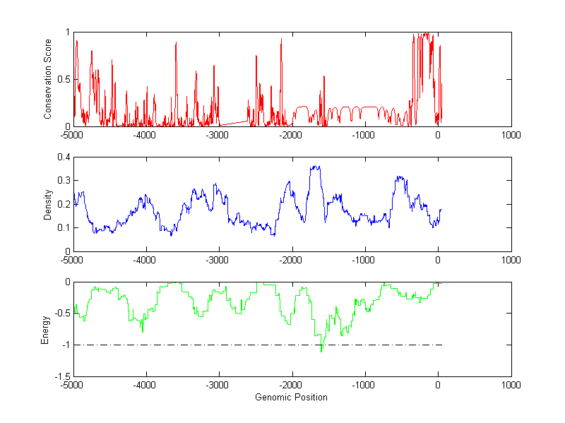 The energy profile (green curve) is about energy for module detection based on TF interaction. The positions with energy less than -1 indicate the existence of CRMs.